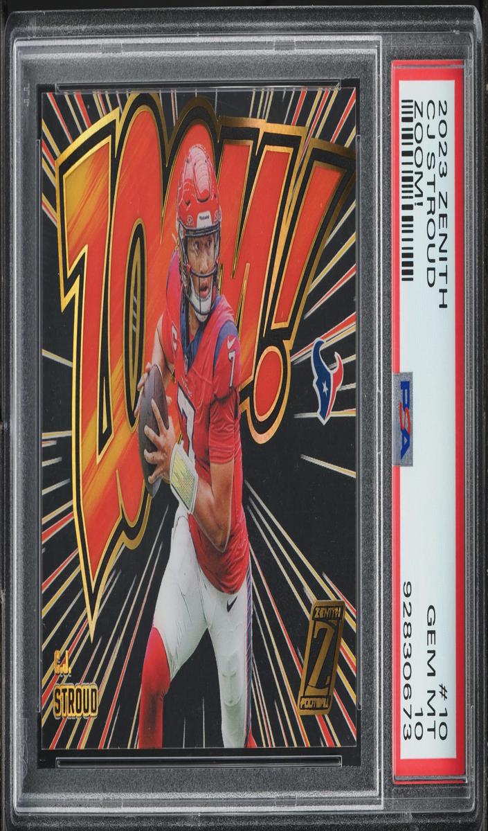 - Price Band: The PSA 9 graded version of the C.J. Stroud 2023 Panini Zenith Zoom Football #10 generally ranges from approximately $119 to $400, with recent sales often clustered around the $160 to $250 range. The ungraded card has recently traded between $166 and $305, indicating a broader and slightly higher price spectrum.