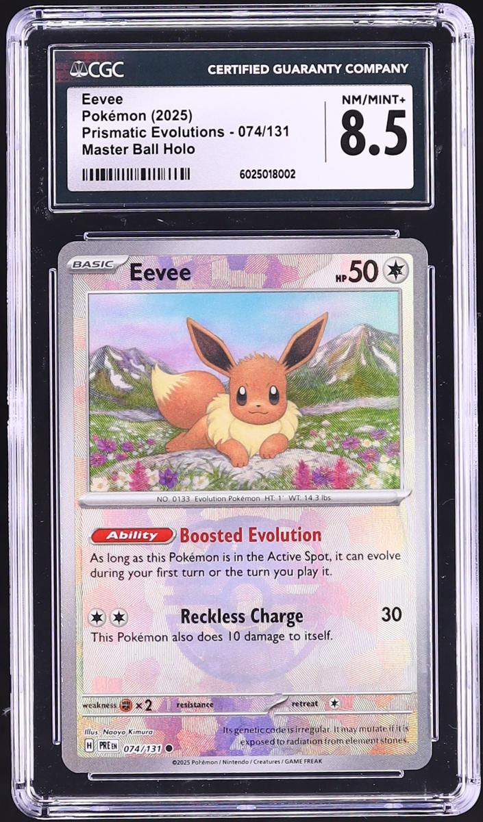- Price Band: The CGC 8.5 graded version of the Eevee 2025 Pokémon Scarlet & Violet Prismatic Evolutions Master Ball#74 typically ranges from approximately $45 to $95, with recent sales around $62.40 on 2/10/25. The raw ungraded cards have shown a wide fluctuation, with prices generally between $5 and $80, indicating a highly volatile market.